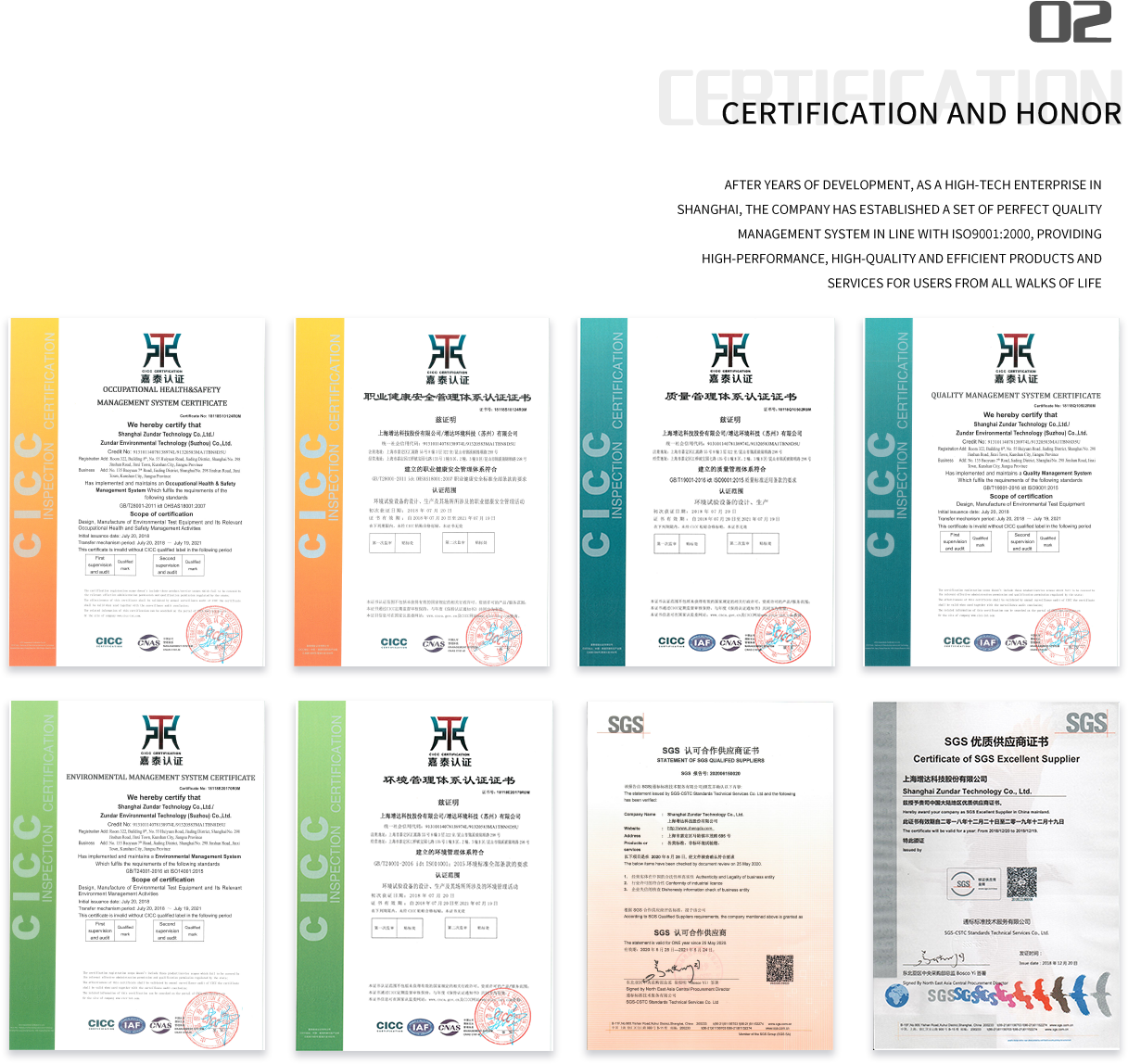 Shanghai Zundar Technology Co., Ltd. (hereinafter referred to as “Zundar” or “Company”) is a high-tech enterprise specializing in R&D and production of climatic simulation test equipment. In order to meet the needs of the company's business development, at the end of 2015, Zundar invested in the establishment of a wholly-owned subsidiary corporation, Jiangsu Zundar Test Technology Co., Ltd. (hereinafter referred to as “Jiangsu Zundar”) in Sutong Science and Technology Industrial Park, Nantong City, Jiangsu Province. Jiangsu Zundar provides the standard climatic test chambers and standardized semi-finished products. At the end of 2017, Zundar invested in the establishment of a wholly-owned subsidiary corporation, Zundar Climatic Technology (Suzhou) Co., Ltd. (hereinafter referred to as “Zundar Suzhou”), in Jinxi Town, Kunshan City, Jiangsu Province. Zundar Suzhou provides non-standard climatic testing equipment. As a result, Shanghai headquarter with R&D and sales center have gradually formed the main body. The two production bases in Nantong and Kunshan are the twin wings.